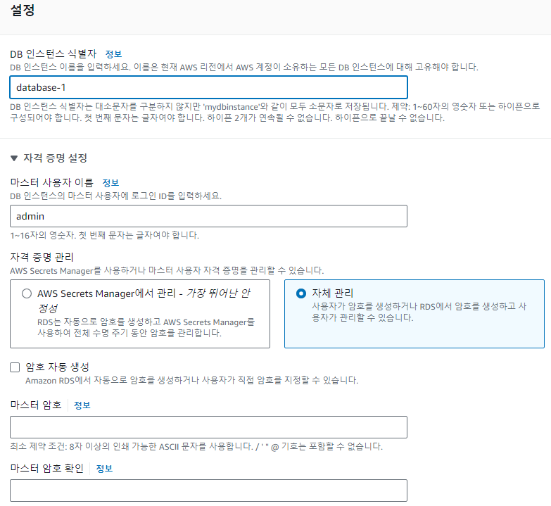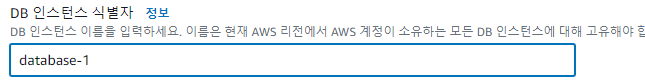 DB 인스턴스 실별자 이름을 원하는 이름으로 지정 해주시고