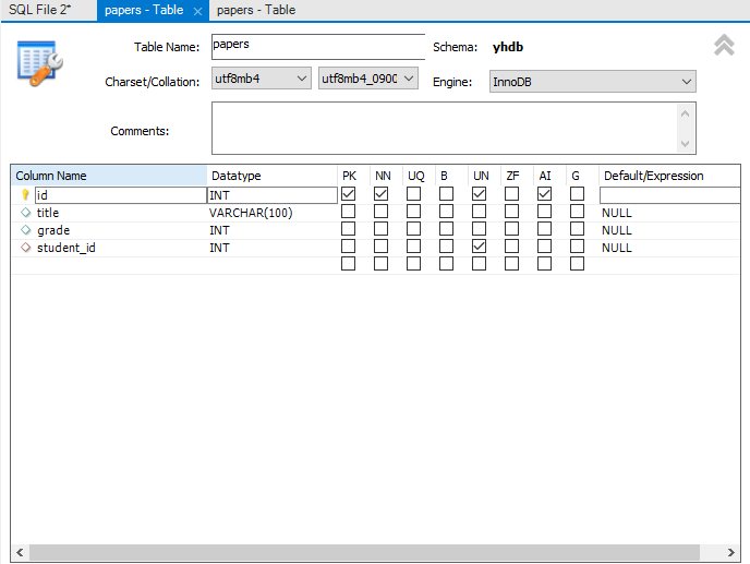 papers 테이블의 student_id는 students 테이블의 id 가 UN 타입이기 때문에 똑같이 UN 으로 맞춰준다.