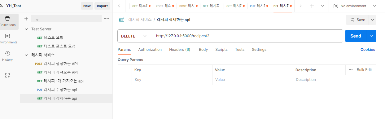 delete는 update와 마찬가지로 클라이언트 한테 받는 정보가 같음으로 똑같이 RecipeResource 클래스에서 진행한다.
