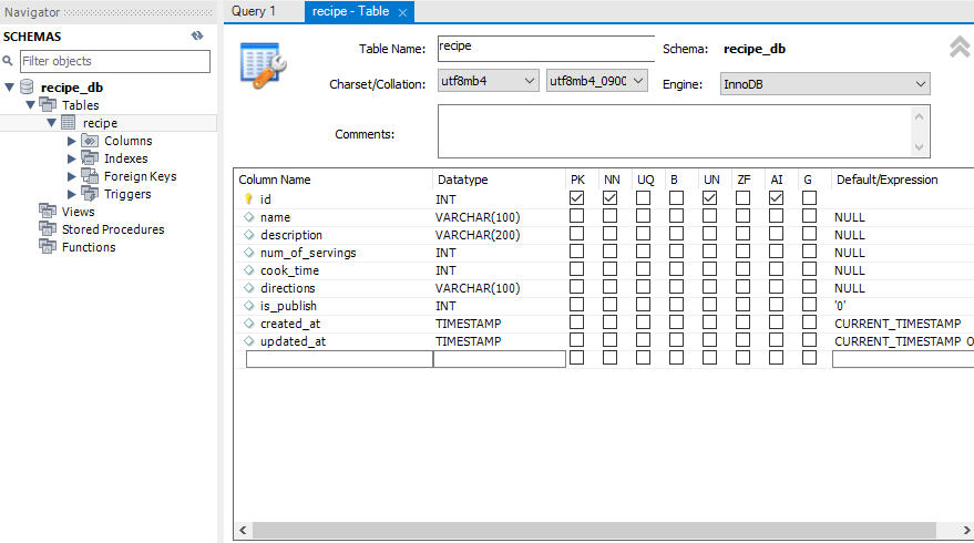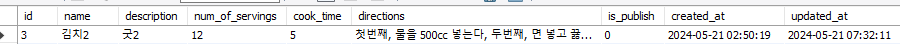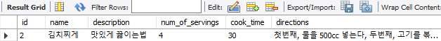 recipe_db 라는 데이터베이스에 recipe 라는 컬럼을 만들었다.