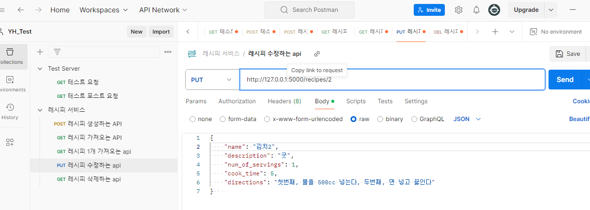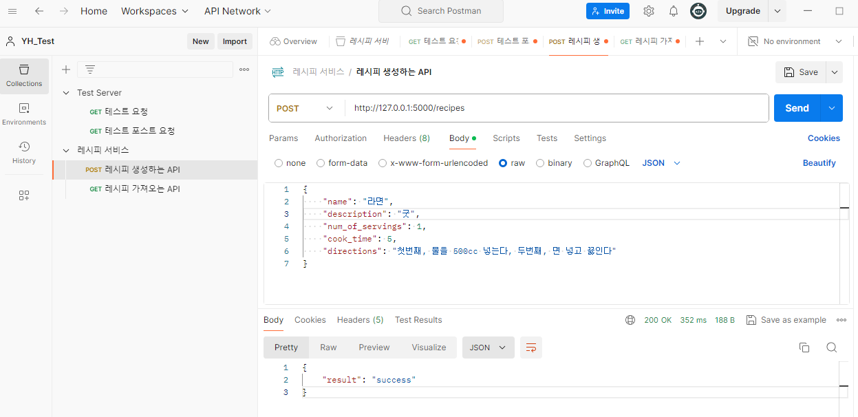 Body에 들어가 딕셔너리 형태의 recipe 데이터를 입력 후 send 를 클릭하면 result:success가 뜨며