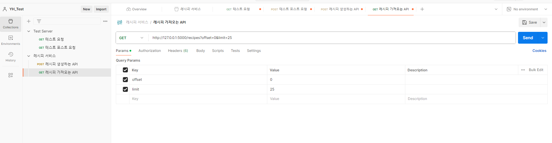 새로운 collentions을 추가 한 후 아까 주소를 입력하고 , params에 offset과 limit을 설정준 후 send 를 누르면