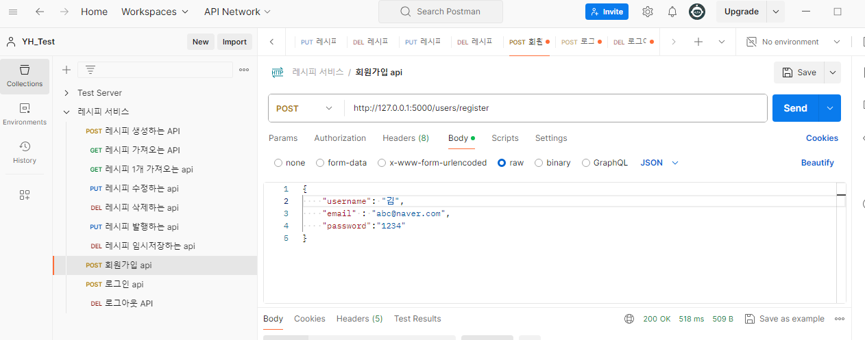 포스트맨에 회원가입 request를 추가하고 주소를 저장해준 후 딕셔너리 형태로 유저이름, 이메일, 패스워드를 지정해준다.