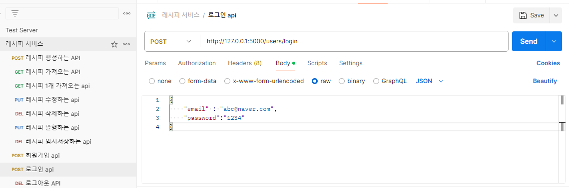 postman에 로그인 api를 생성하고 이메일과 패스워드를 입력하는 Body를 생성해준다.