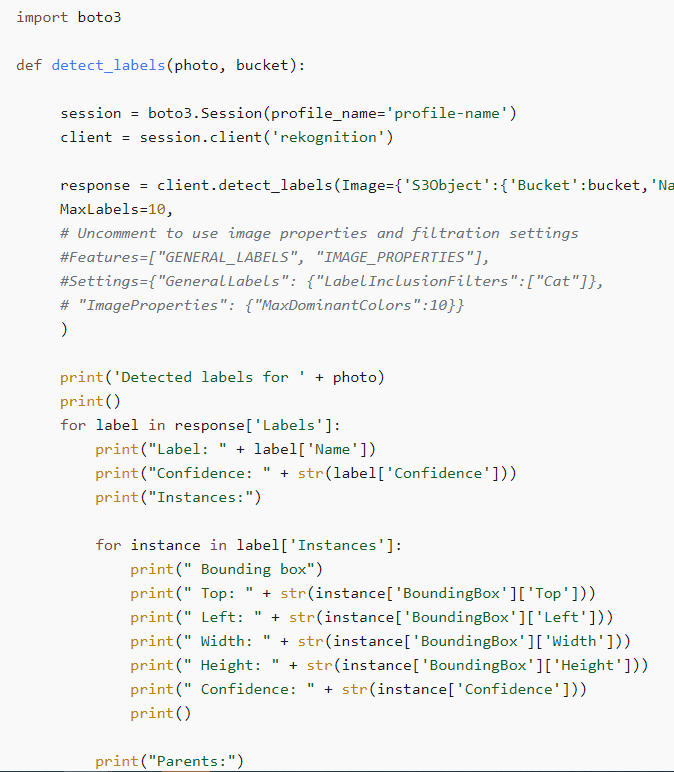 detect_labels는 Amazon Rekognition의 기능 중 하나로, 이미지나 비디오 파일에서 객체, 사람, 텍스트 및 활동을 감지하고 식별하는 데 사용된다. 이 기능을 사용하면 이미지에서 특정 라벨(예: "사람", "자동차", "동물" 등)을 자동으로 탐지할 수 있다.