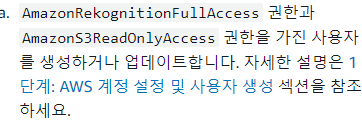 aws IAM에서 AmazonRekohnition을 권한 추가해준다.
